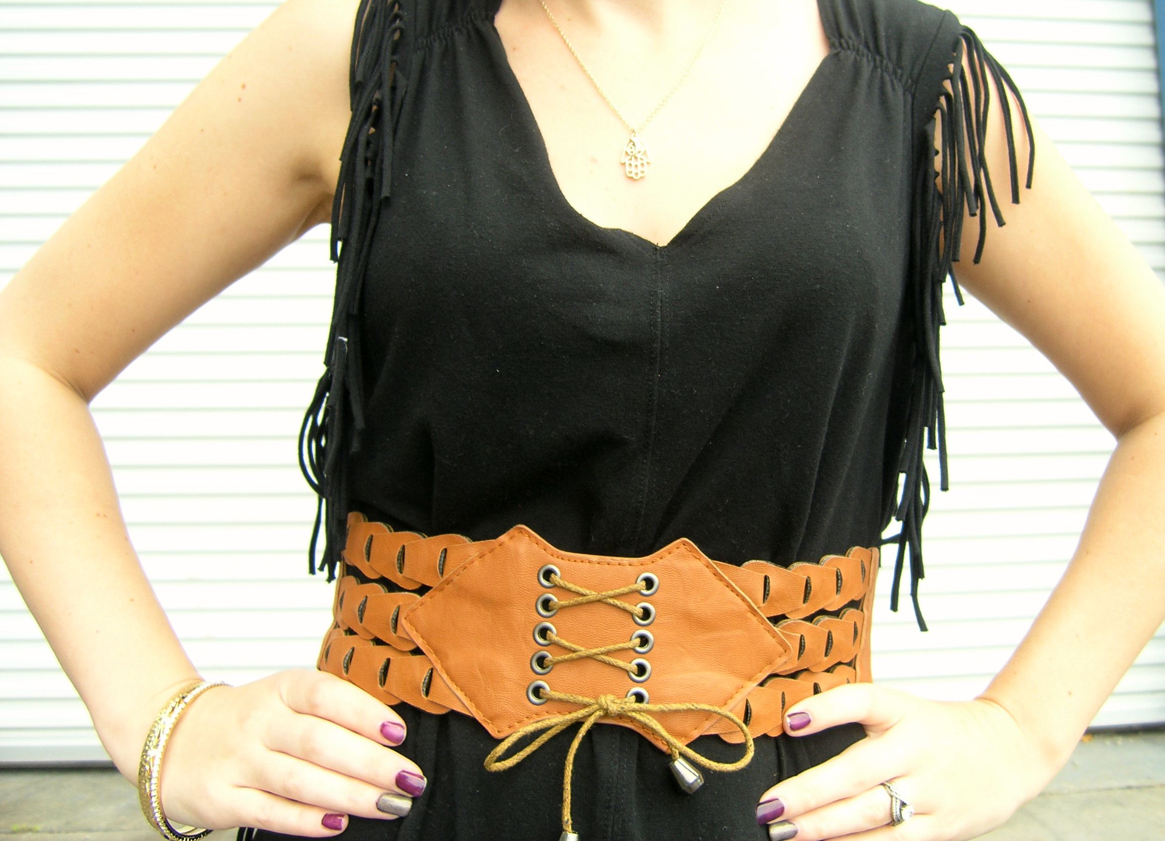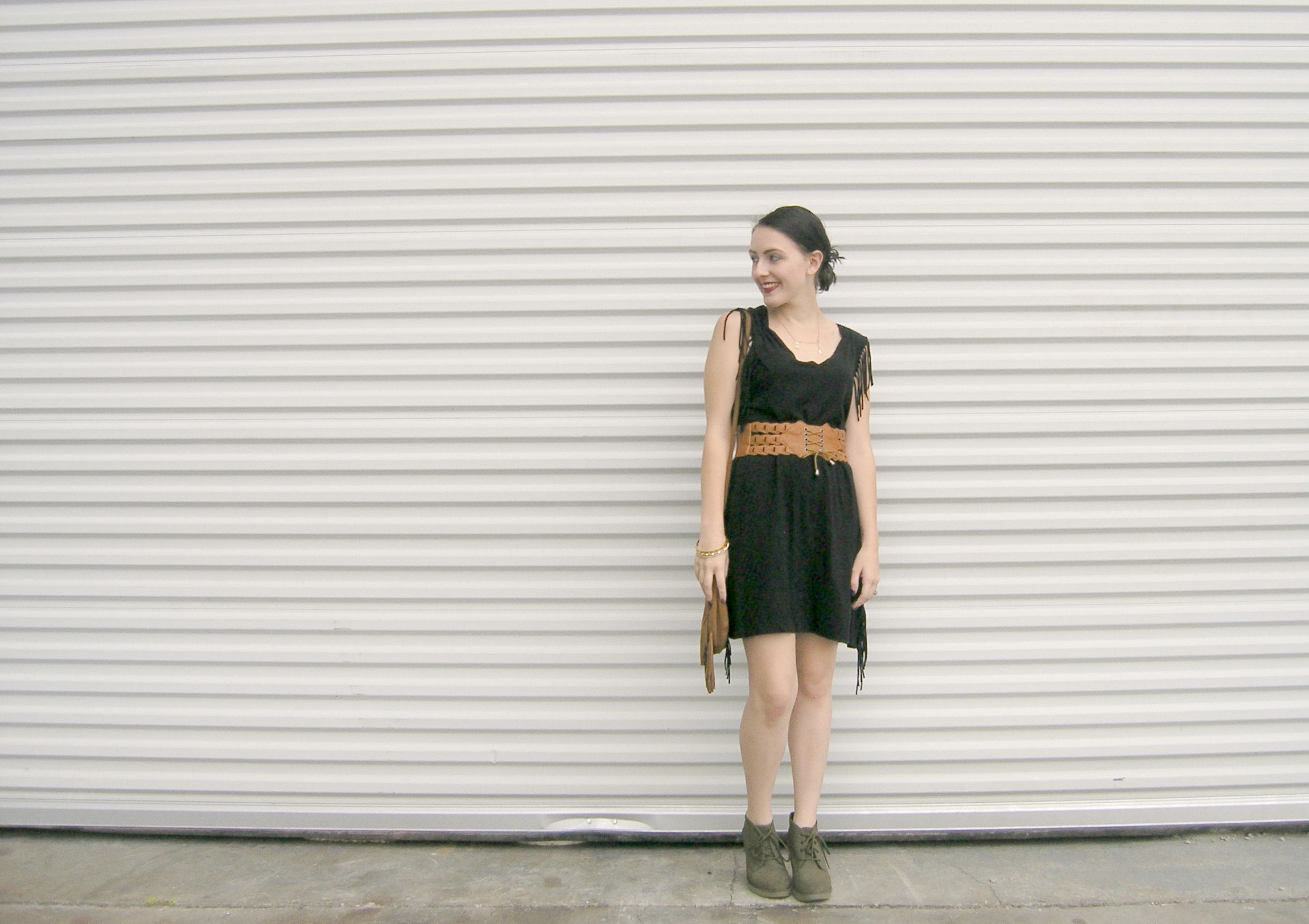What I wore: Black Fringe Dress: Forever 21//Brown Fringe Purse: Areopostale//Belt: Ross// Shoes: Old Navy//Gold Bangles: Courtesy of my awesome MIL. She has good taste.
