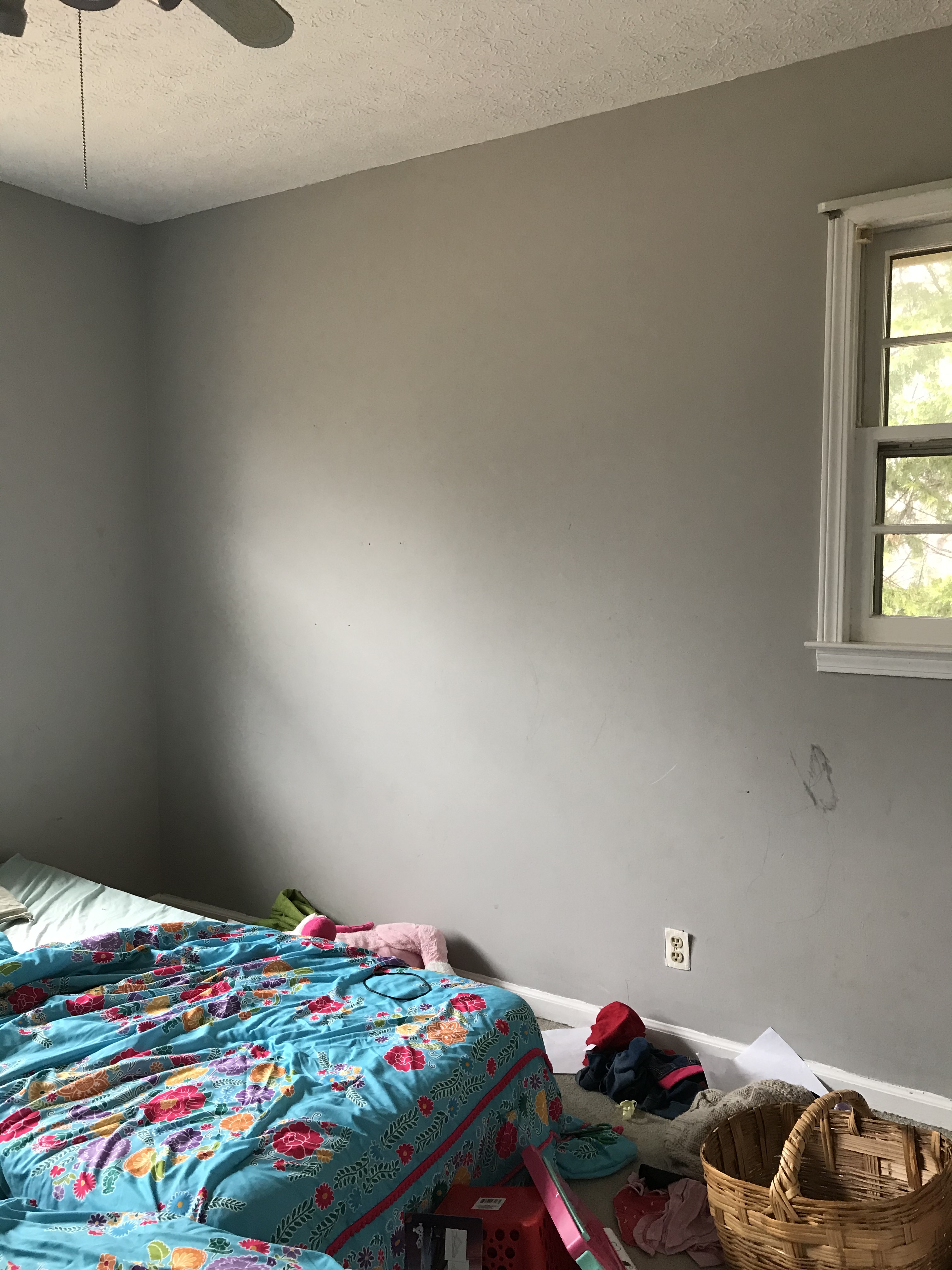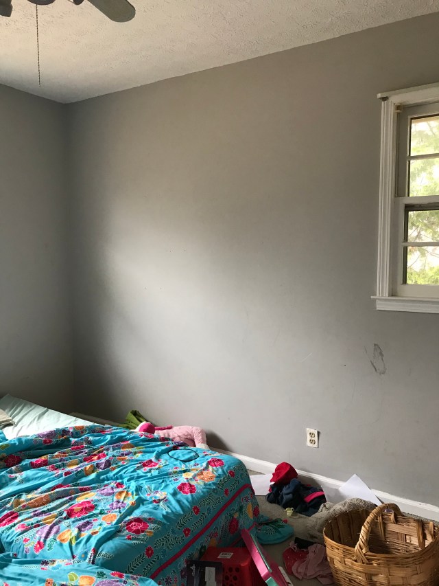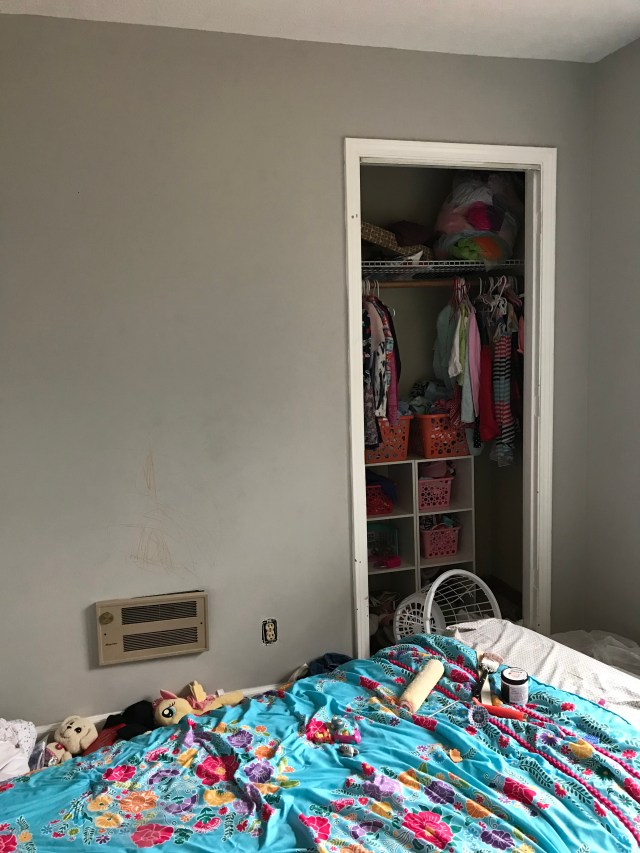 There’s something just so special about designing a kids room! I wanted to create a space for my girls that was fun, whimsical, and could grow with them. A neutral color palette was important to me because a neutral color pallette equals versatile and that’s just what I love in a kids room. We got this paint in the clearance section of home depot for $9 for the entire gallon! I was thrilled. It’s amazing what a fresh coat of paint can do. All together, this room makeover cost less than $100 and snagging the paint on clearance definitely helped keep the costs low. Fred and I ripped out the carpets to uncover the beautiful hardwood floors underneath. I used cheap, wooden spice racks from Ikea to create shelving that they can hang their jewelry from and store precious trinkets on. We used a lot of what we already had which helped with the price tag of this room makeover but over all, I am so pleased with it!