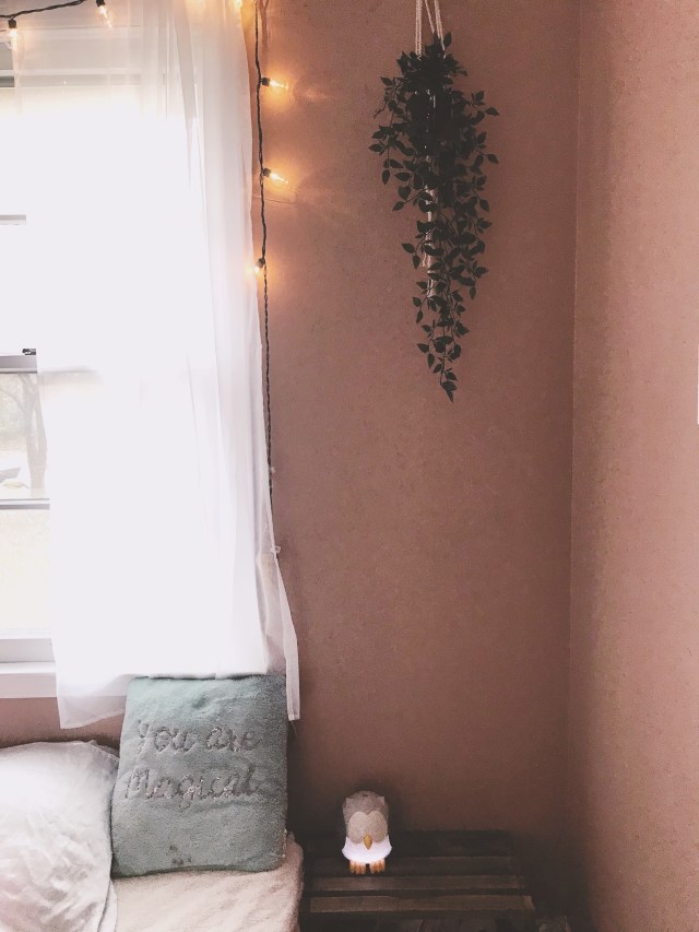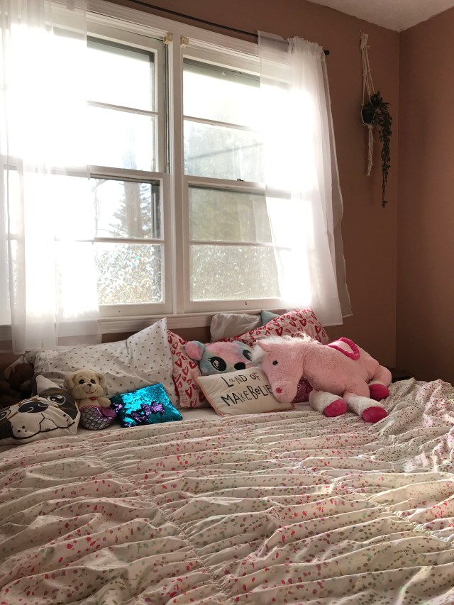 We grabbed these sheer curtains off of amazon to keep the room feeling light and airy. We added holographic window cling to the lower panels for privacy and when the sun shines through them, it casts beautiful rainbows all over the room! I ten/ten recommend getting some of this. It is so fun and the girls love watching the rainbows come into their room each afternoon. Also, it was easy peasy to apply. Since the girls always end up in the same bed together anyways, we pushed both of their twin beds together. Later on, we will probably add bunkbeds and a toddler bed once Luna gets old enough to move in with the big girls. Like I mentioned at the beginning of this post, versatile kids rooms are essential. Keep in mind when designing a kids room how the space can effortlessly grow with your kiddos. The corner next to the dresser still needs a little love so I’m waiting for a Saturday afternoon chunk of free time where I can make a DIY macramé curtain for this window. We also added a little wooden doll house to this corner since these pictures were done. We used wooden crates that we had stored down in the basement as bedside tables for each side of the bed. Lastly, we added string lights around the window to add a soft glow to the space. Making the window the headboard/focal point of the room makes this small space feel much bigger.